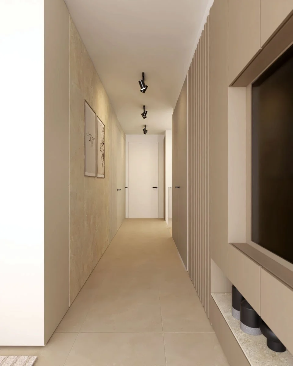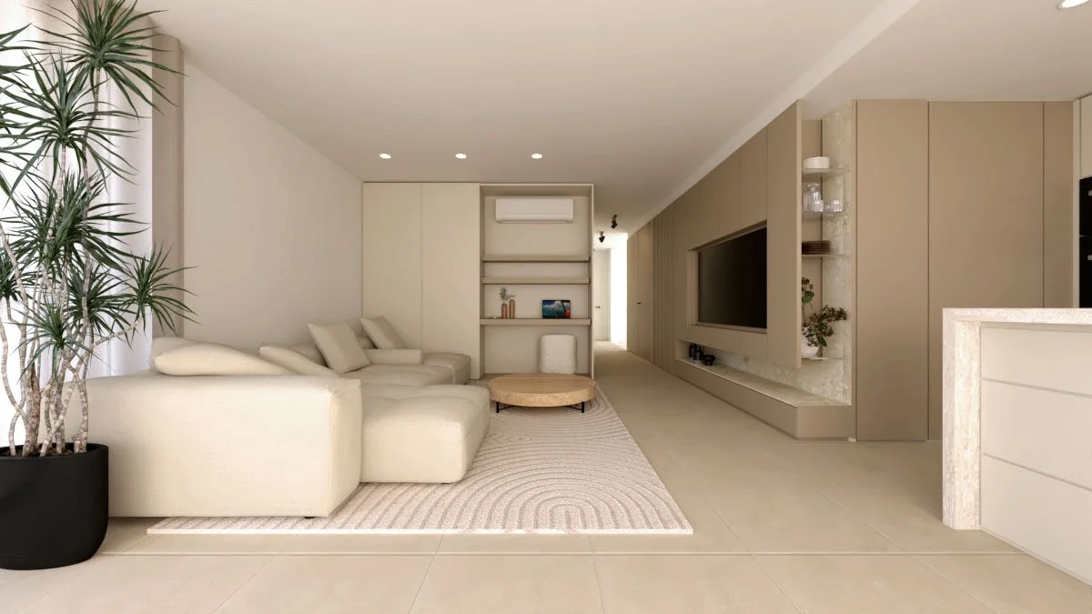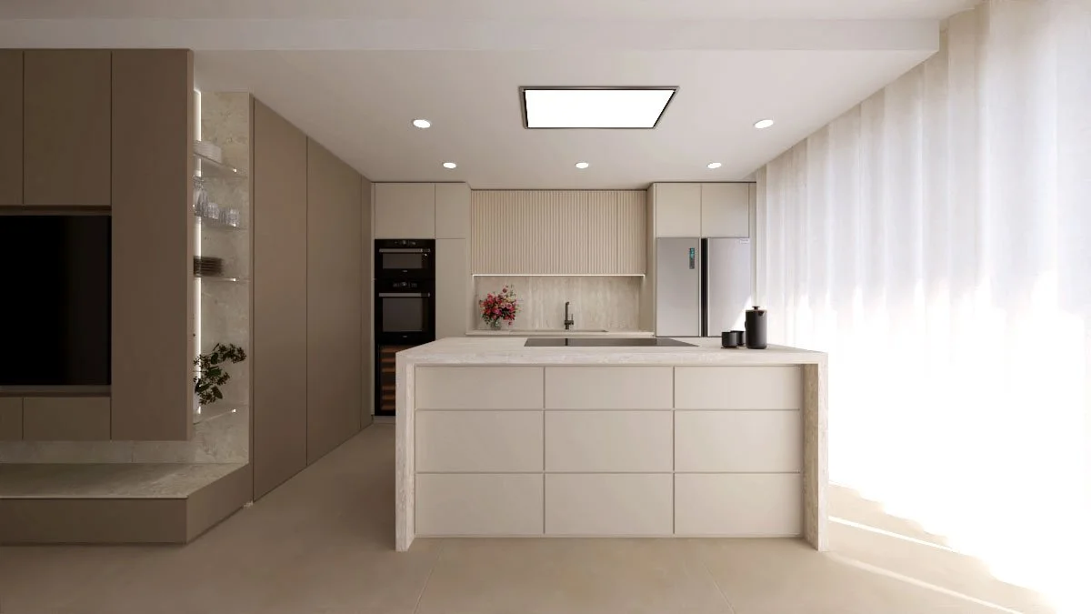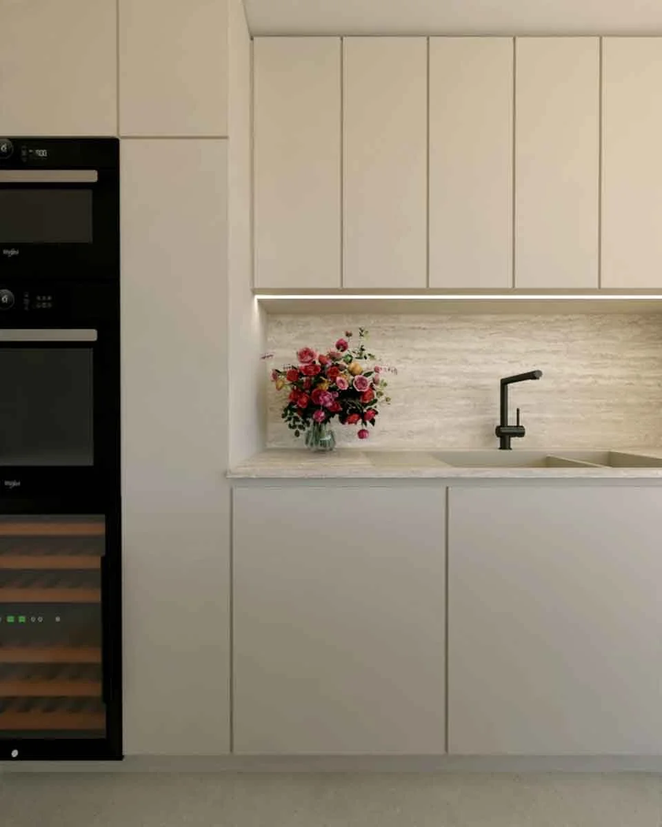 Odgovor se je oblikoval v prepletanju funkcionalnosti in nežne elegance. Shranjevalne površine se skrivajo za čistimi linijami, pohištvo je zasnovano z več funkcijami, vsak element pa dopušča različne rabe skozi čas. Prevladujejo nevtralni toni in vzdržljive obloge, ki zagotavljajo trajnost, medtem ko lahko lastniki z barvnimi poudarki dodajajo osebni izraz.